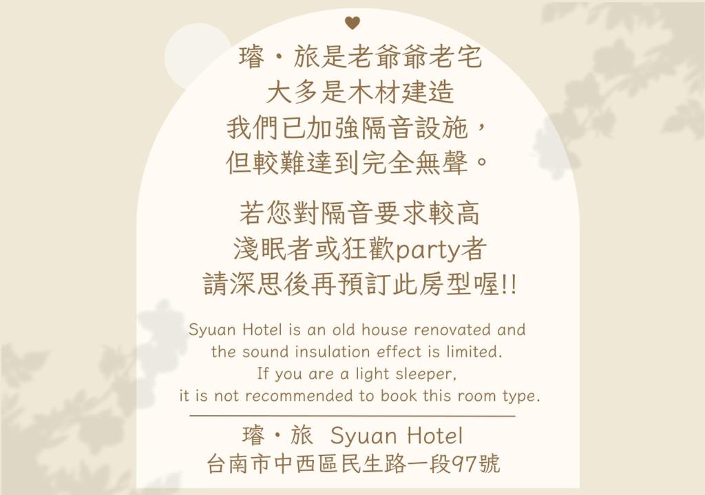 璿旅 Syuan Hotel是間,藏身在中西區的古色古香的街道上。正如他們所說,璿旅 Syuan Hotel 位於台南,靠近台南孔廟和赤崁樓,提供 WiFi(免費)和免費私人停車位。 每個房型都設有私人衛浴和沖洗座、空調、平面電視以及冰箱。 璿旅 Syuan Hotel 距離內門紫竹寺 34 公里,距離旗山老街 41 公里。台南機場距離住宿 5 公里。